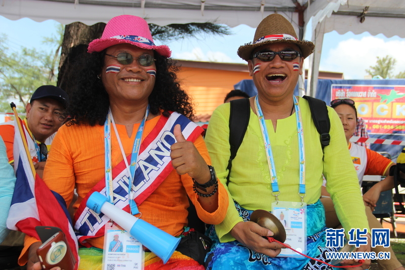 ??? 11月16日,泰國民眾為泰國運動健兒加油。中國體育代表團16日在泰國普吉舉行的第四屆亞洲沙灘運動會上勇奪2枚金牌和2枚銅牌。當天比賽全部結束時,中國隊以3金2銀5銅的成績暫列獎牌榜第五,東道主泰國隊以9金11銀12銅的成績暫列金牌榜和獎牌榜第一。新華社發(塔納攝)