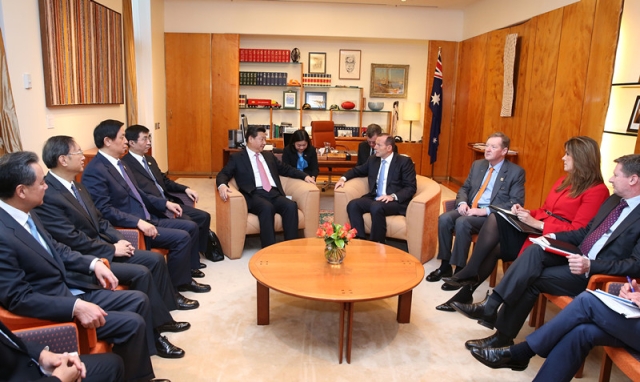 ??? 11月17日,中國國家主席習近平與澳大利亞總理阿博特在澳大利亞首都堪培拉舉行會談。新華社記者龐興雷攝