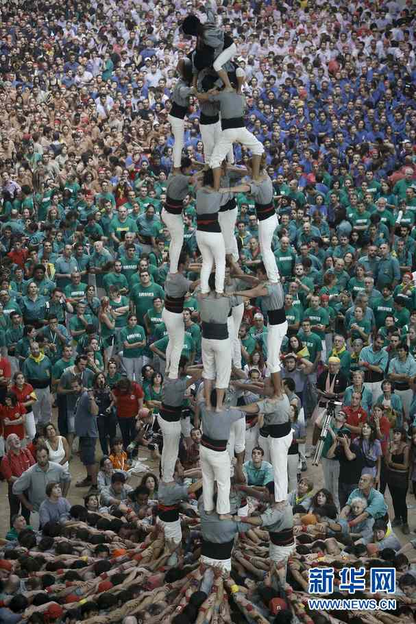 ????在西班牙加泰羅尼亞地區的塔拉戈納市(Tarragona)舉行的一次“疊人塔”大賽上,Jana爬到Sants區代表隊的頂端。新華社巴塞羅那分社攝影師Pau Barrena 攝?