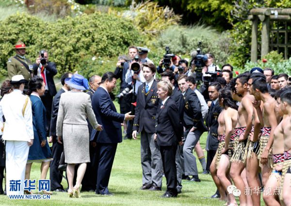????在總督府前的草坪上,5名勇士赤膊光足,身系草裙,一面揮舞長矛,一面吆喝,并不時吐出舌頭。為首的勇士緩緩走到習主席面前,將一把短劍投在地上,習主席俯身拾起。毛利族人確定習主席一行是為和平而來的善者。隨后,毛利族女子引吭高歌,數十名毛利族青少年跳起傳統的哈卡舞……