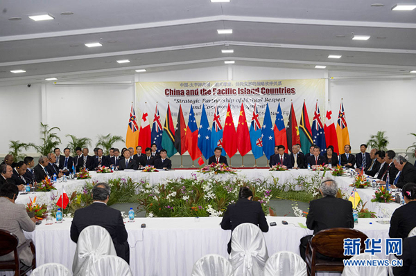 ???? 11月22日,國(guó)家主席習(xí)近平在楠迪同斐濟(jì)總理姆拜尼馬拉馬、密克羅尼西亞聯(lián)邦總統(tǒng)莫里、薩摩亞總理圖伊拉埃帕、巴布亞新幾內(nèi)亞總理奧尼爾、瓦努阿圖總理納圖曼、庫(kù)克群島總理普納、湯加首相圖伊瓦卡諾、紐??偫硭忍窖髰u國(guó)領(lǐng)導(dǎo)人舉行集體會(huì)晤。習(xí)近平主持會(huì)議并發(fā)表主旨講話。新華社記者 饒愛(ài)民攝