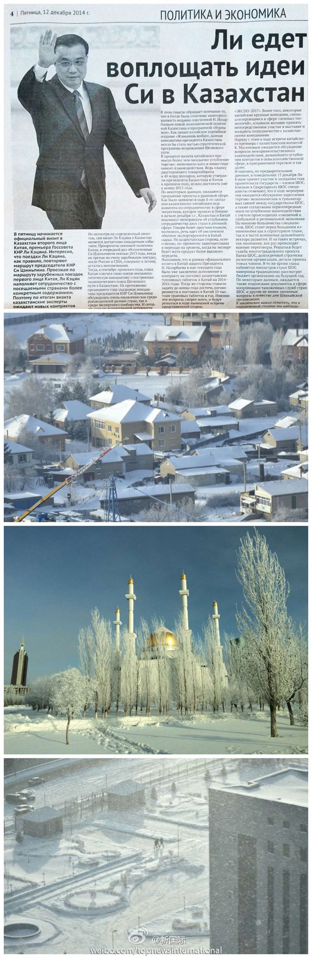 ????新華網北京12月13日電 據新華社“新國際”微博報道,哈薩克斯坦首都阿斯塔納冰天雪地,當地各界對李克強來訪的期待卻相當熱切。總統府、總理府工作人員周末都在加緊籌備。哈通社記者穆卡諾夫說,中國總理來訪對他們來說是大新聞,他和同事將全程報道。他很關心哈中合作,希望中國的發展和經驗能幫助哈更好發展。