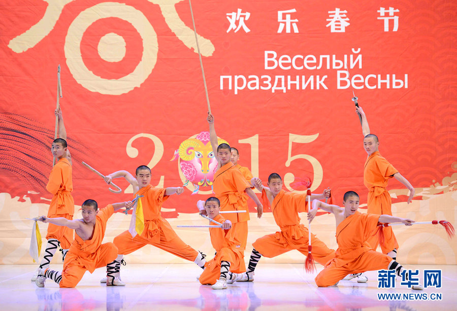 ????新華網塔什干2月6日電(記者 沙達提)2月4日晚,在烏茲別克斯坦首都塔什干突厥宮,藝術家在表演中國武術。由中國文化部、中國駐烏茲別克斯坦大使館、烏外交部、烏文化體育部和塔什干市政府共同聯辦、河南省文化廳攜鄭州歌舞劇院、登封市少林塔溝武術學校承辦的2015“歡樂春節”中亞行演出4日至5日在塔什干突厥宮分別為烏茲別克斯坦政府官員、各界友好人士、駐烏使節和旅烏各族華僑華人、維吾爾文化中心、東干文化中心及中資企業、教師和留學生代表近1600余人獻上充滿濃郁中國特色的文化藝術盛宴。