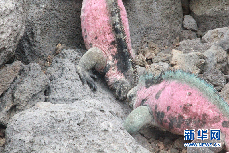 兩只佛羅雷阿納島上的海鬣蜥在爭奪地盤。到了繁殖期的海鬣蜥皮膚會呈現出大紅大綠的顏色,情緒也會高漲起來。