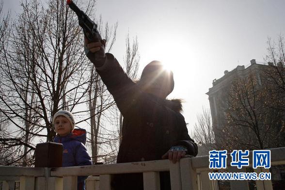????資料圖片:2月15日,在烏克蘭東部城市頓涅茨克,一名男孩手持玩具槍在街頭玩耍。烏克蘭武裝力量總參謀部發言人謝列茲尼奧夫15日說,自當地時間凌晨3時起,烏東部沖突地區的槍炮射擊均已停止,?;饏f議得到遵守。 新華社發(葉爾莫琴科攝)