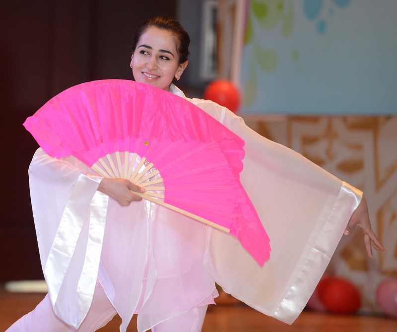 4月28日,在烏內務部文化宮禮堂活動現(xiàn)場,撒馬爾罕外國語學院的UGILOY(中文名:雅靜)在參加比賽。新華網記者 沙達提攝