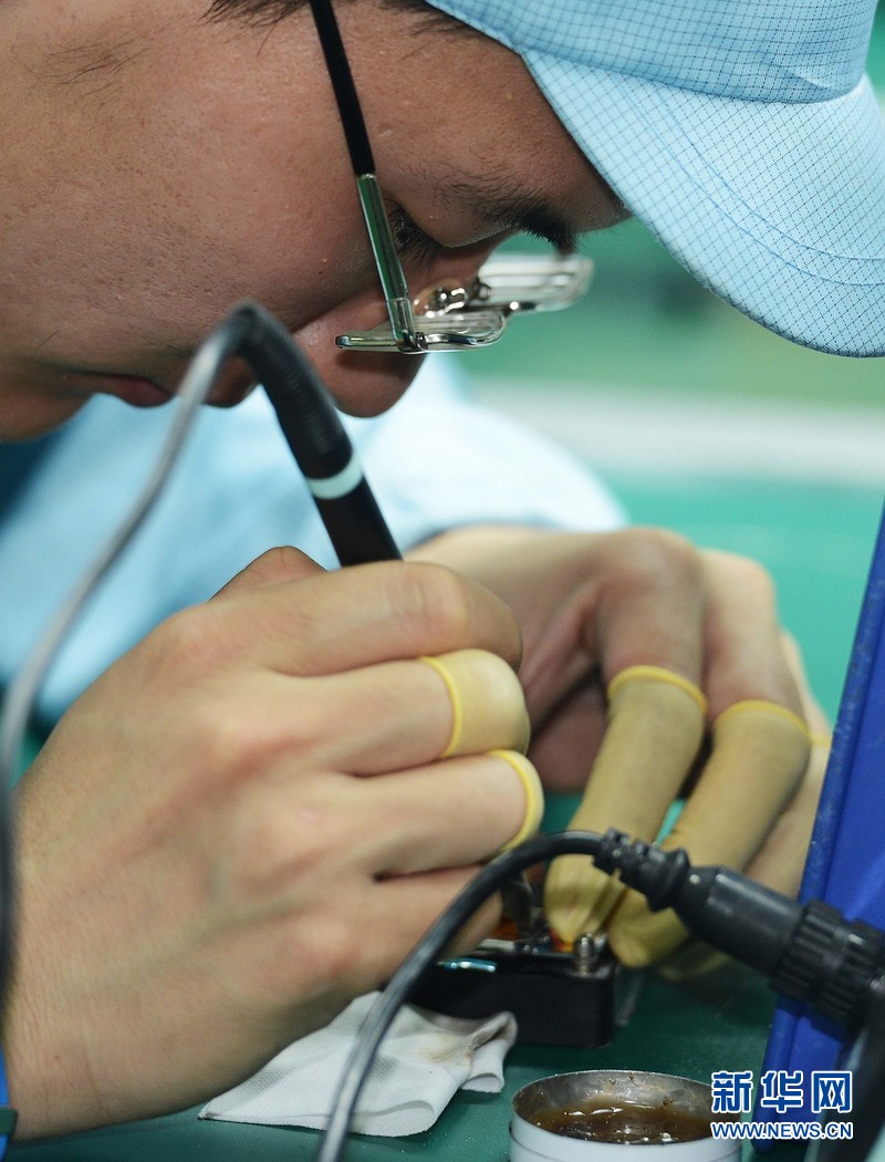 4月18日,在烏茲別克斯坦吉扎克工業特區錫爾河分區的鵬盛工業園區,工人在鵬中興盛合資有限公司手機生產車間工作。新華社記者沙達提