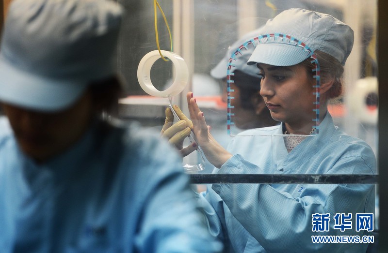 4月18日,在烏茲別克斯坦吉扎克工業特區錫爾河分區的鵬盛工業園區,工人在鵬中興盛合資有限公司手機生產車間工作。新華社記者沙達提攝