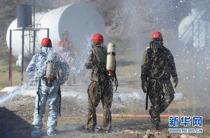 6月3日,代表中國參加上合組織國際救援聯合演練的新疆消防總隊隊員在哈薩克斯坦阿拉木圖州塔姆卡壘塔斯景區的哈內務部緊急情況委員會教練基地“巖石城-阿斯塔納”參加演練。新華社記者沙達提攝