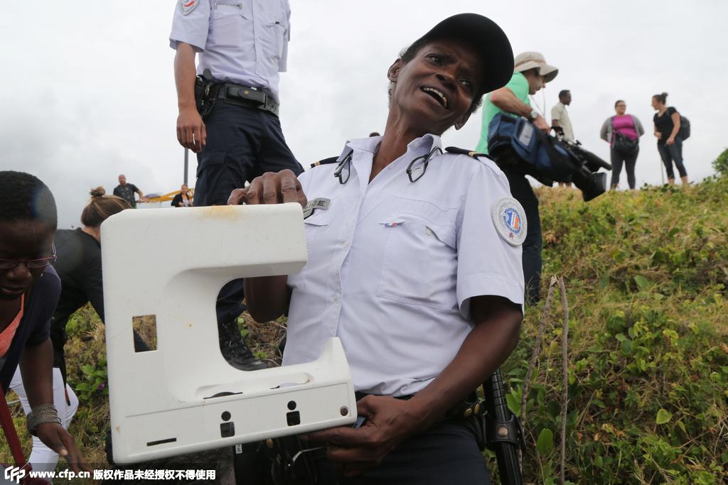 當地時間2015年8月4日,法屬留尼汪島圣但尼,警察在當地發現一塊塑料殘片。