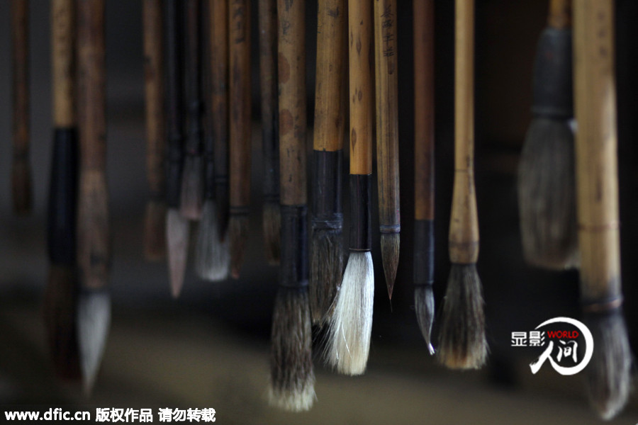 2015年2月24日,中國江蘇南京的一間公寓里,王錚(音譯)父親使用的毛筆懸掛在那里蒙上一層灰很久沒人使用。他的父親在馬航MH370事件中失聯無消息。