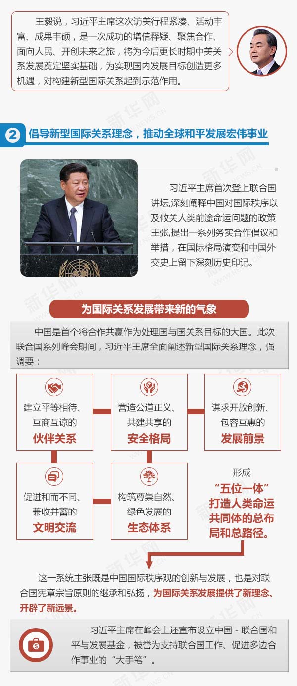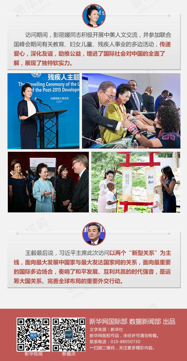2015年9月22日至28日,國家主席習(xí)近平對(duì)美國進(jìn)行國事訪問并出席聯(lián)合國成立70周年系列峰會(huì)。行程結(jié)束之際,外交部部長王毅向記者介紹此訪情況。