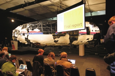 13日下午在海牙舉行的新聞發布會上,荷蘭調查人員展示了MH17航班前半截殘骸的重組。調查人員給在墜機現場尋獲的每塊殘骸編號、拍照、掃描、分組,在荷蘭南部的希爾澤-賴恩空軍基地部分還原了客機機鼻、駕駛艙和商務艙。當扭曲且布滿彈孔的客機殘骸出現在眼前時,現場媒體記者一片沉寂。