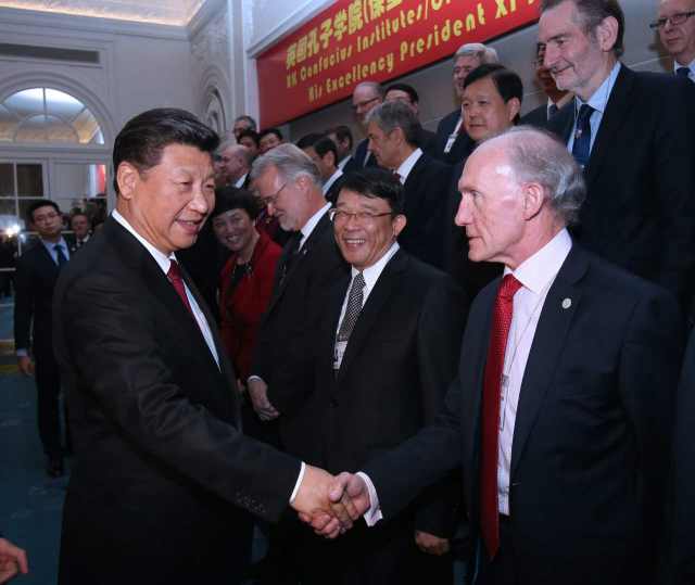 習近平指出,近年來,孔子學院在英國快速發展。目前,英國已經建立起29所孔子學院和126個孔子課堂,數量居歐洲之首。全英孔子學院取得的碩果也是中英人文交流蓬勃發展的縮影。通過人文交流,中英兩國文化中的精華正在對兩國人民的思維方式和生活方式產生著奇妙的“化學反應”。“為之不厭,誨人不倦。”希望在座各位教師再接再厲,為中英友好事業添磚加瓦。希望孔子學院繼續秉承“相互尊重、友好協商、平等互利”的校訓,為傳播文化、溝通心靈、促進世界文明多樣性作出新的更大貢獻。