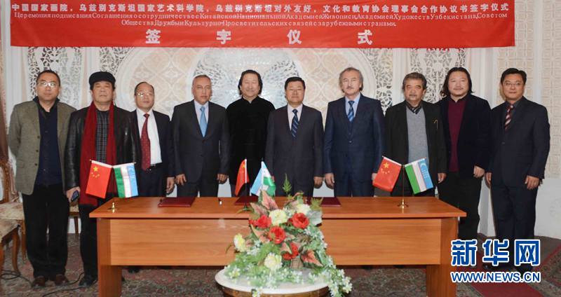 當天上午,中國國家畫院院長楊曉陽與烏茲別克斯坦對外友協副主席阿比多夫和烏茲別克斯坦國家藝術科學院院長努爾金諾夫,在中國駐烏茲別克斯坦大使孫立杰以及烏媒體代表共同見證下,分別在協議書上簽字。協議聲明,三方將定期為兩國藝術家開展美術創作、研究提供條件,定期舉辦創作寫生、藝術展覽及學術研討等文化藝術交流活動。