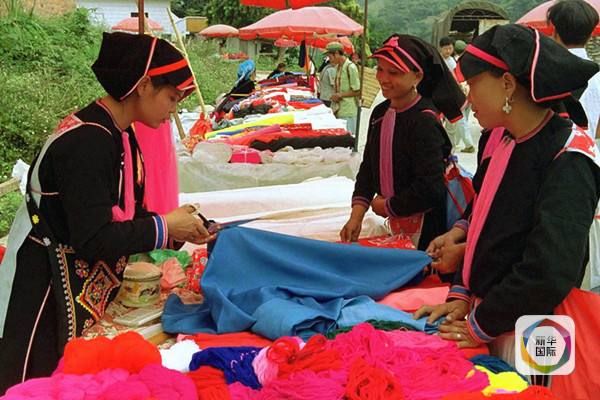 2002年2月9日,在云南省金平縣金水河鄉,瑤族婦女李春蘭(左)在中越邊境的金水河口岸向越南少數民族婦女出售布料。