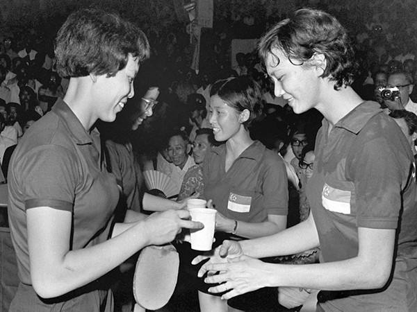 1972年7月8日至7月15日,中國(guó)乒乓球代表團(tuán)應(yīng)邀對(duì)新加坡進(jìn)行友好訪問(wèn)。訪問(wèn)期間,中、新兩國(guó)運(yùn)動(dòng)員通過(guò)友好比賽,相互學(xué)習(xí),交流經(jīng)驗(yàn),增進(jìn)了友誼。圖為中、新兩國(guó)乒乓球運(yùn)動(dòng)員在比賽場(chǎng)上。