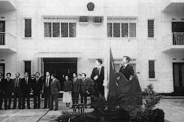 1990年10月15日,中國(guó)駐新加坡大使館舉行開館升旗儀式。新華社記者李永明攝
