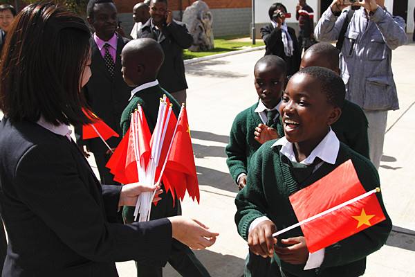 2012年6月26日,一名津巴布韋小學生在中國駐津大使館舉行的“開放日”活動上接過中國國旗,并學說“你好”。(新華社記者許林貴攝)