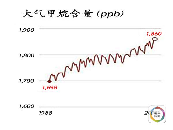 美國國家海洋和大氣管理局統計,2014年大氣中甲烷的含量是工業革命前的2.5倍強。