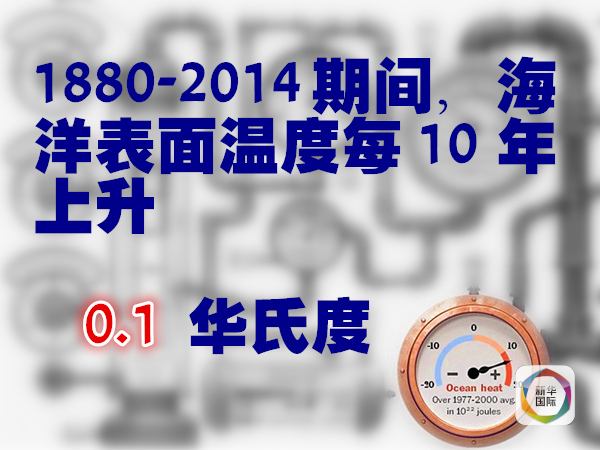 據美國獨立機構氣候總站統計,從1880年到2014年,海洋表面溫度每10年平均升高0.1華氏度。如果按照海洋儲存熱量的變化來看,以10的22次方焦耳為單位、1971年為基準,1955年海洋儲存熱量在負3個單位以下,2014年則超過13個單位。