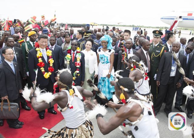上午10時15分左右,專機降落,習主席和夫人彭麗媛走下旋梯。奏中津兩國國歌,鳴21響禮炮,檢閱儀仗隊,當地兒童獻花環和鮮花……前來迎接的津巴布韋總統穆加貝,為習主席舉行了隆重的歡迎儀式。
