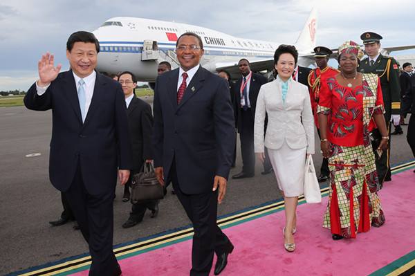 圖為2013年3月24日,國家主席習近平乘專機抵達達累斯薩拉姆尼雷爾國際機場,開始對坦桑尼亞進行國事訪問。坦桑尼亞總統基奎特和夫人到機場迎接習近平和夫人彭麗媛。(新華社記者 蘭紅光攝)
