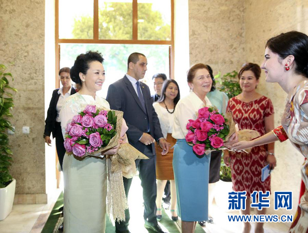 彭麗媛在卡里莫娃陪同下抵達孔子學院,塔什干國立東方學院院長、孔子學院中方和烏方院長等在門前迎接。孔子學院學生代表身著中烏兩國民族服裝,向彭麗媛和卡里莫娃獻花。