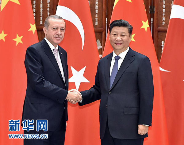 9月3日,國家主席習近平在杭州會見來華出席二十國集團領導人杭州峰會的土耳其總統埃爾多安。新華社記者 李濤 攝