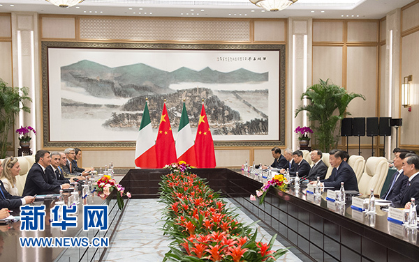 習近平歡迎倫齊來華出席二十國集團領導人杭州峰會。習近平指出,近年來,中意關系取得長足進步,雙方秉承相互尊重、互利共贏精神,深化政治互信,擴大務實合作,使兩國人民獲得實實在在的利益。中方愿同意方攜手努力,不斷推進兩國全面戰略伙伴關系向前發展。我們要堅持兩國戰略互信大方向,尊重彼此核心利益和重大關切,密切兩國政府、議會、政黨交流合作。要堅持互利共贏原則,優勢互補,實現共同發展。中方歡迎意方積極參與“一帶一路”建設。我們要以古老文明為依托,密切人文交流,深化傳統友誼。要加強在國際和地區事務中的協調和配合,努力構建以合作共贏為核心的新型國際關系。要將中歐和平、增長、改革、文明四大伙伴關系落到實處,共同維護中歐關系良好發展勢頭。