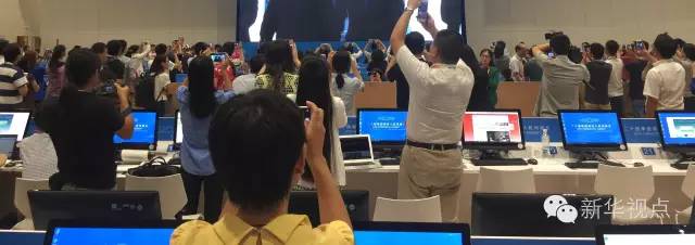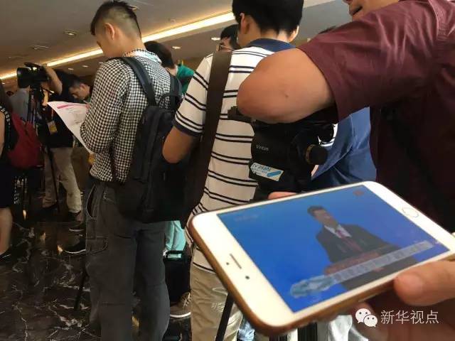 由于峰會現(xiàn)場場地有限,許多記者無法到會場實地進行采訪報道。不愿錯過精彩瞬間的他們架起“長槍短炮”,對準新聞中心內(nèi)正在直播開幕式實況的大屏幕。