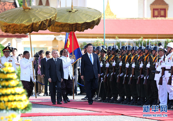 10月13日,國家主席習近平在金邊會見柬埔寨國王西哈莫尼。會見前,習近平出席西哈莫尼在王宮舉行的盛大歡迎儀式。 新華社記者姚大偉攝