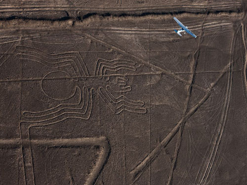 ????站在地面上的話,你幾乎看不到納斯卡線,它們由淺色泥土畫成,兩邊由深色石頭畫的線來提亮。這個地區有數量眾多的納斯卡線——長達幾千米的碎片狀的三角形和矩形,非寫實的動物和鳥類圖案:一只猴子,一只禿鷹,一只完全對稱的蜘蛛,一只蜂鳥。