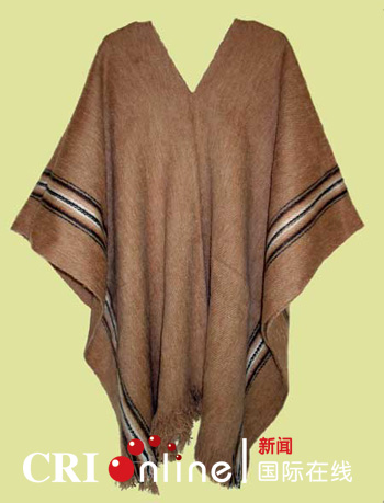 ????彭丘是用羊駝毛織成的披風,面料質地十分細膩,胸口開V字領,形狀像長方形的毛毯,兩側的擺有黑白相間的傳統花邊。顏色采取深棕色,披在身上呈寬松的倒三角廓形,傳統花邊的點綴極具地域特色。