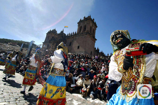 2011年7月7日,在秘魯庫斯科,人民在街頭表演,慶祝印加遺址馬丘比丘發現百年。新華社/法新