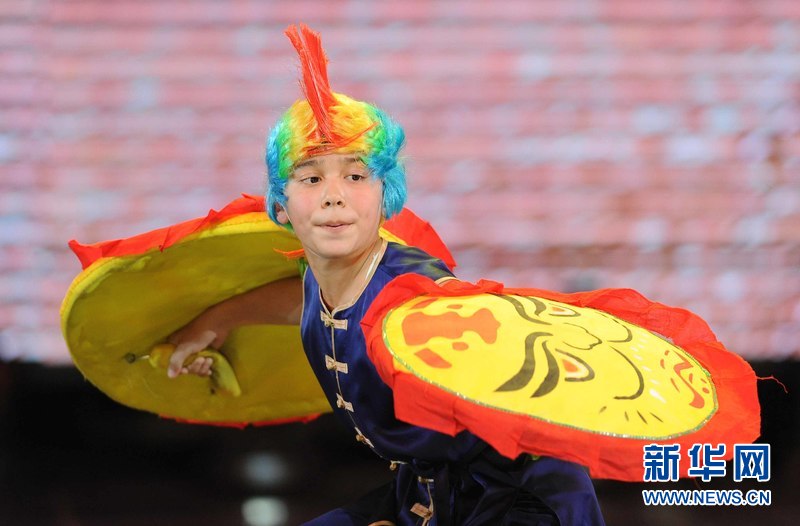 1月18日晚,烏茲別克斯坦首都塔什干人民友誼宮,烏茲別克斯坦中華民族文化中心武術(shù)隊隊員在表演武術(shù)。