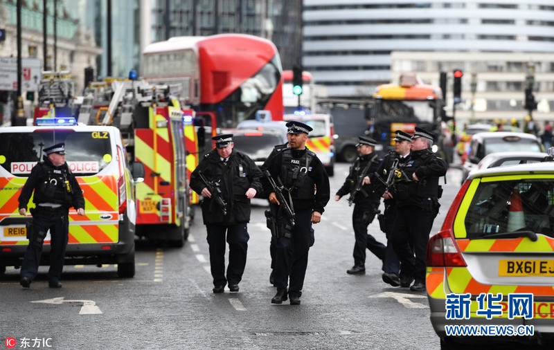 當地時間2017年3月22日,英國倫敦,英國威斯敏斯特議會大廈附近發生襲擊事件,威斯敏斯特橋上有車輛沖撞行人;另外有持刀歹徒攻擊議會大廈執勤警察后被擊斃,報道稱多人受傷。襲擊發生后,議會大廈臨時關閉,英國議會下院的會議暫停。倫敦警方目前暫時將此事作為恐怖事件處理。據外媒報道,英國警方封閉了倫敦議會大廈周邊的街道。圖片來源:東方IC