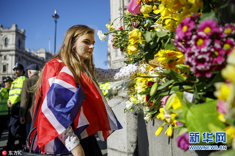 當(dāng)?shù)貢r間2017年3月25日,英國倫敦,民眾在議會外擺放鮮花,哀悼恐襲受害者。圖片來源:東方IC