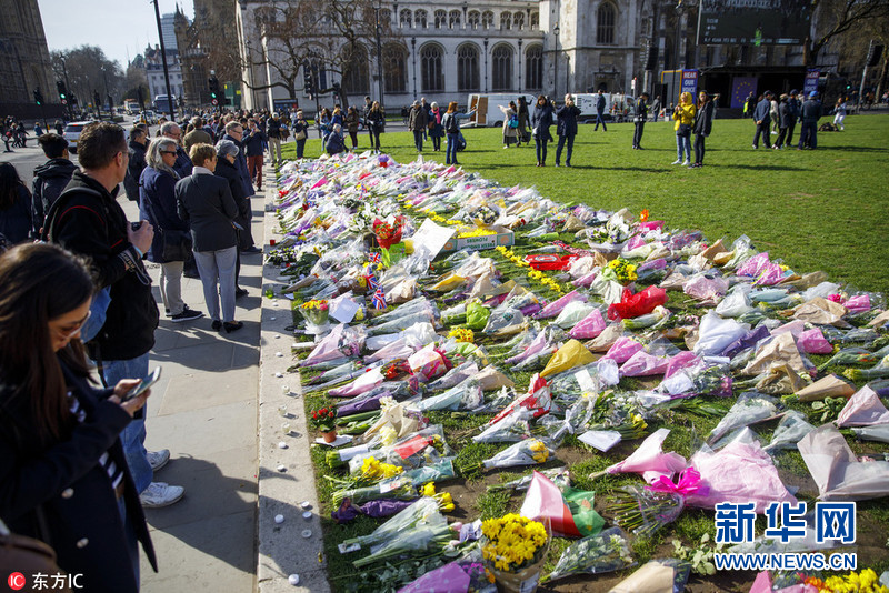 英國(guó)民眾在議會(huì)外擺放鮮花 哀悼恐襲受害者(組圖)