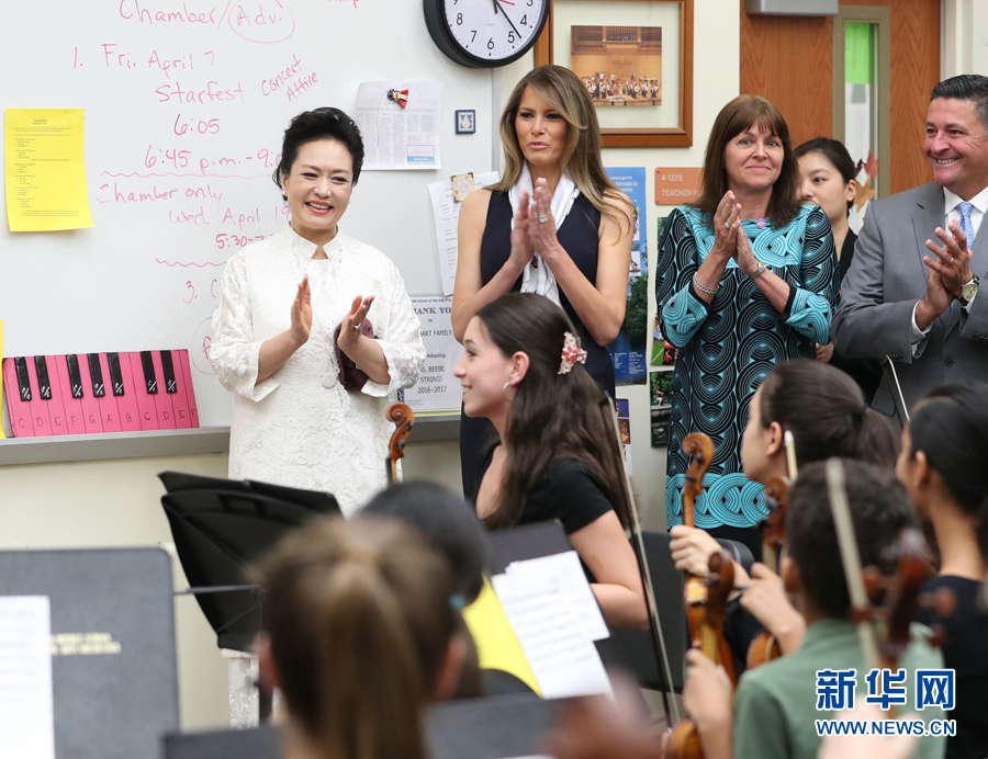 當地時間4月7日上午,應美國總統夫人梅拉尼婭邀請,國家主席習近平夫人彭麗媛參觀位于佛羅里達州西棕櫚灘市的巴克藝術中學。這是彭麗媛在弦樂教室參觀時為同學們的精彩演出鼓掌。新華社記者王曄攝
