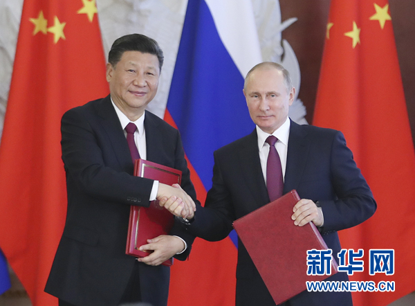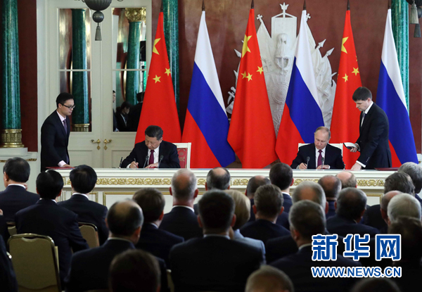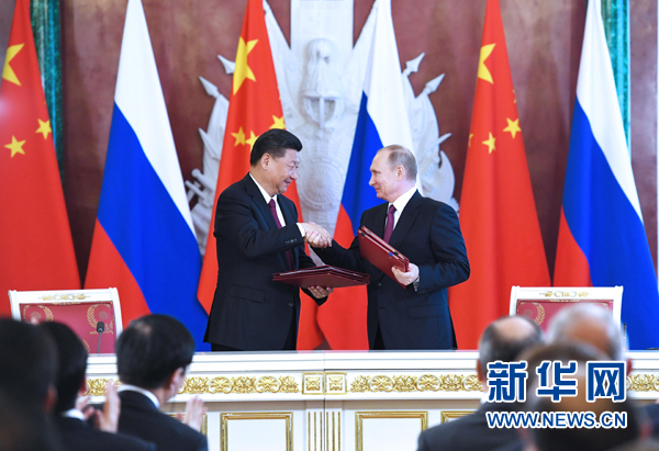 7月4日,國家主席習(xí)近平在莫斯科克里姆林宮同俄羅斯總統(tǒng)普京舉行會談。會談后,兩國元首簽署了《中華人民共和國和俄羅斯聯(lián)邦關(guān)于進(jìn)一步深化全面戰(zhàn)略協(xié)作伙伴關(guān)系的聯(lián)合聲明》《中華人民共和國和俄羅斯聯(lián)邦關(guān)于當(dāng)前世界形勢和重大國際問題的聯(lián)合聲明》,批準(zhǔn)了《〈中華人民共和國和俄羅斯聯(lián)邦睦鄰友好合作條約〉實(shí)施綱要(2017年至2020年)》并見證了《中華人民共和國外交部和俄羅斯聯(lián)邦外交部關(guān)于朝鮮半島問題的聯(lián)合聲明》以及經(jīng)貿(mào)、農(nóng)業(yè)、能源、基礎(chǔ)設(shè)施建設(shè)、金融、文化、創(chuàng)新、媒體、信息網(wǎng)絡(luò)、檢驗(yàn)檢疫等領(lǐng)域多項(xiàng)雙邊合作文件的交換。新華社記者 謝環(huán)馳 攝