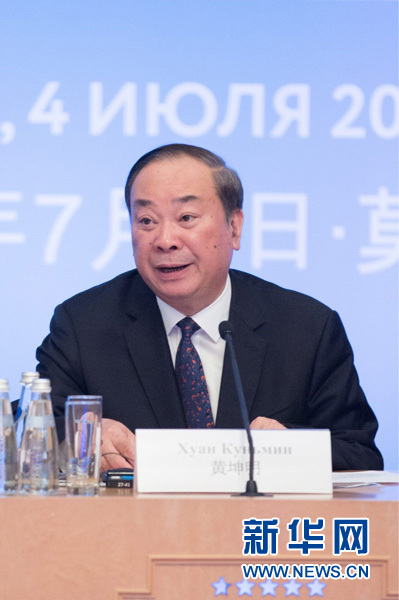 7月4日,中共中央宣傳部常務副部長黃坤明在第三屆中俄媒體論壇上發言。新華社記者 吳壯 攝