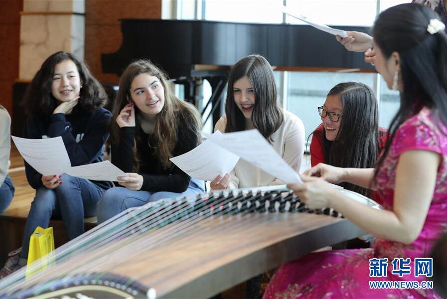 2017年5月5日,在中國駐美國紐約總領館舉行的“感知中國”活動中,一名老師為美國學生展示古箏彈奏。新華社記者王迎攝