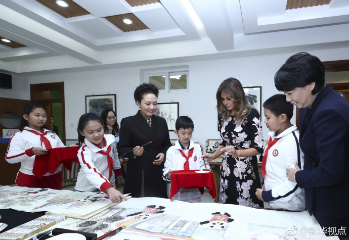 彭麗媛和梅拉尼婭在古建筑教室。(記者白潔、鞠鵬)(據新華社“新華視點”微博報道)