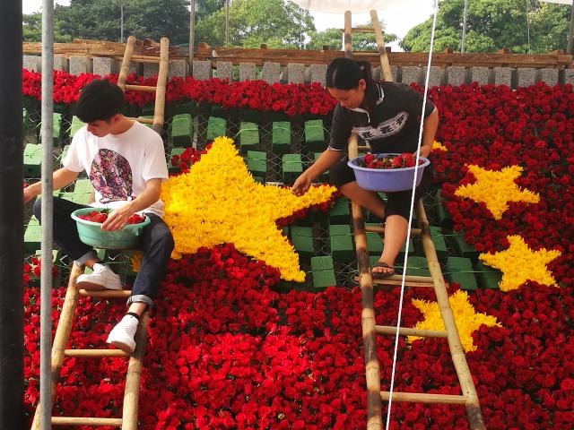 這是花匠們在為越中友誼宮落成移交儀式作準備。新華社記者侯麗軍攝
