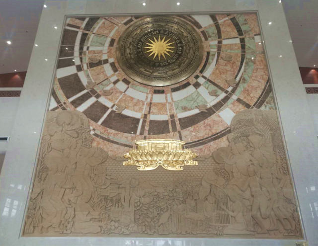剛剛竣工的越中友誼宮,即將迎來一場盛大的落成移交儀式。記者抵達時,花匠們正在門口精心布置,用鮮花擺出中國和越南國旗的式樣。步入大廳,由中央美術學院歷時七個月設計的大型壁畫《山水相依 友誼長存》撲入眼簾——核心元素是中越古代共有的樂器“銅鼓”,寓意兩國文化交融源遠流長。畫面中下部是身著傳統服飾的中越民眾形象,或翩翩起舞,或引吭高歌,或手捧豐收果實,喜樂祥和中傳遞著中越之間濃厚的情誼。