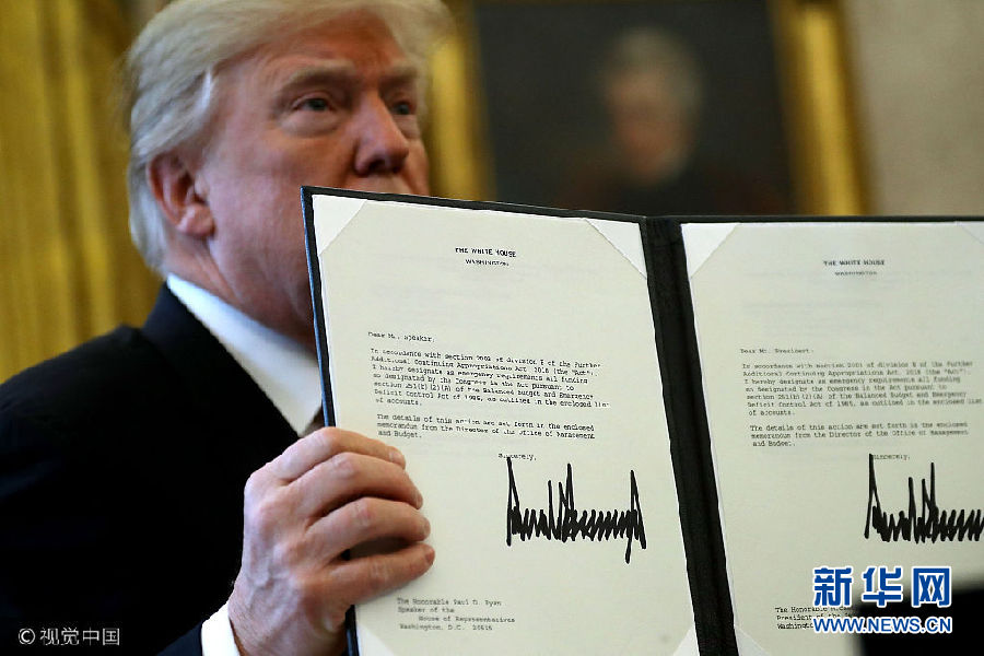 當(dāng)?shù)貢r(shí)間22日,美國華盛頓,美國總統(tǒng)特朗普在白宮的橢圓形辦公室簽署1.5萬億美元稅改法案,此乃美國最近逾30年來最大規(guī)模減稅行動。(圖片來源:視覺中國)