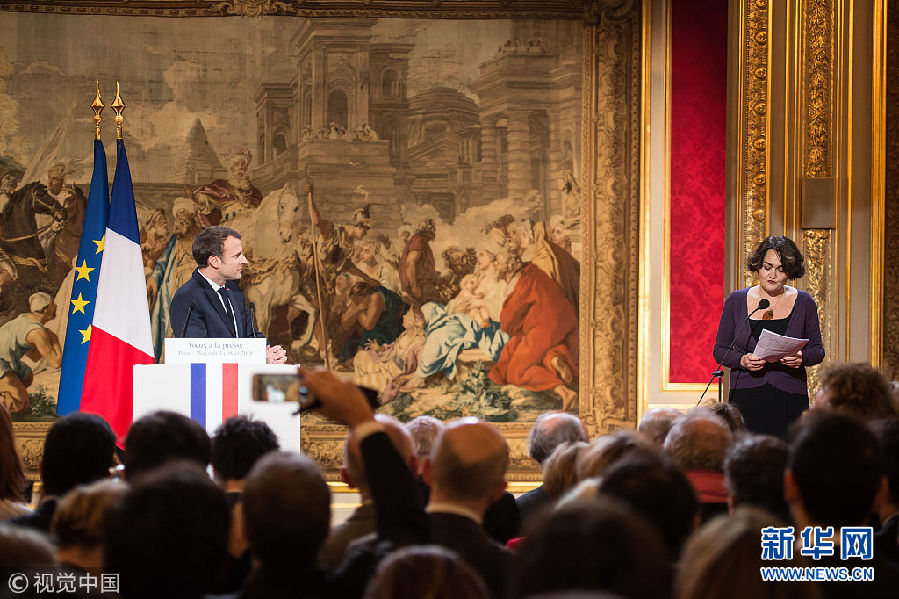 1月3日,法國總統馬克龍在愛麗舍宮向記者團送上新年祝福。(圖片來源:視覺中國)
