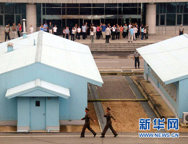 2004年7月26日拍攝的資料照片顯示,來自世界各國的游客在板門店韓國一側(cè)(上)參觀,畫面下部為板門店朝鮮一側(cè)兩名正在執(zhí)勤的朝鮮人民軍士兵。新華社記者姬新龍攝