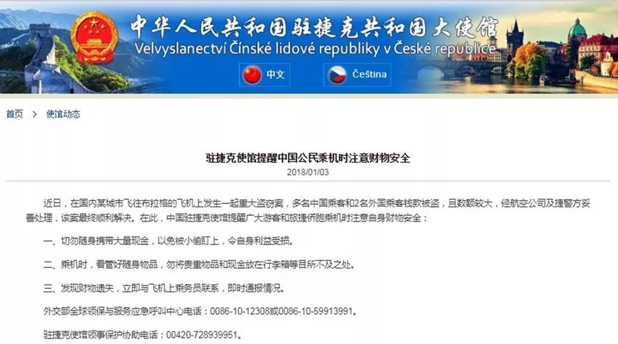 中國駐捷克使館提醒廣大游客和旅捷僑胞乘機時注意自身財物安全: